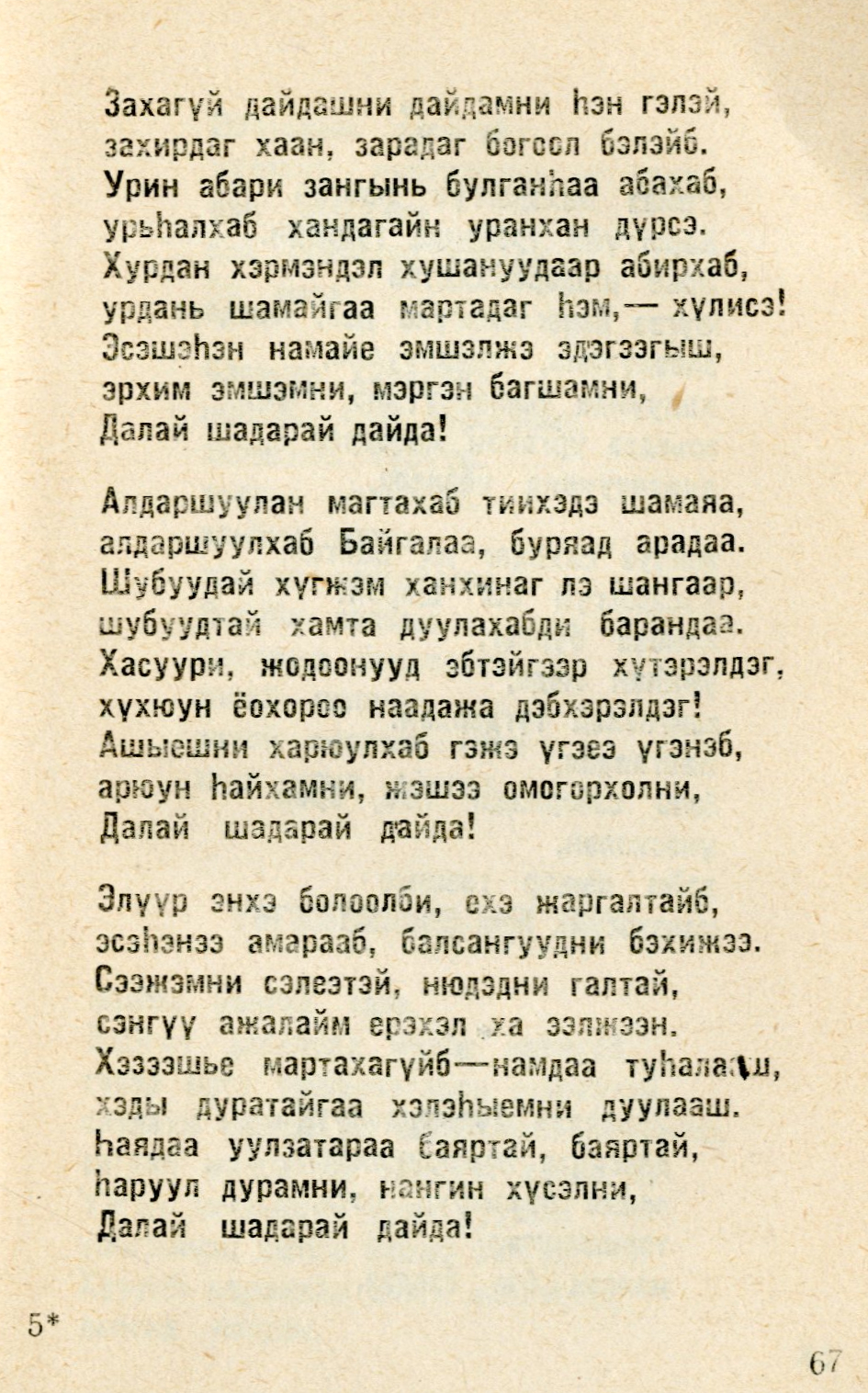 Бадмаев, Ц. Б. Байгалай эрьедэ / Ц. Б. Бадмаев // Бадмаев, Ц. Б. Тоонто. – Улаан-Үдэ, 1966. – Н. 19-20.