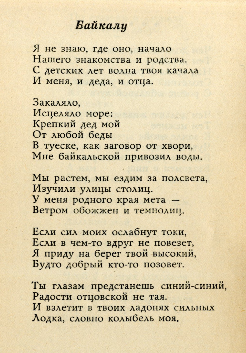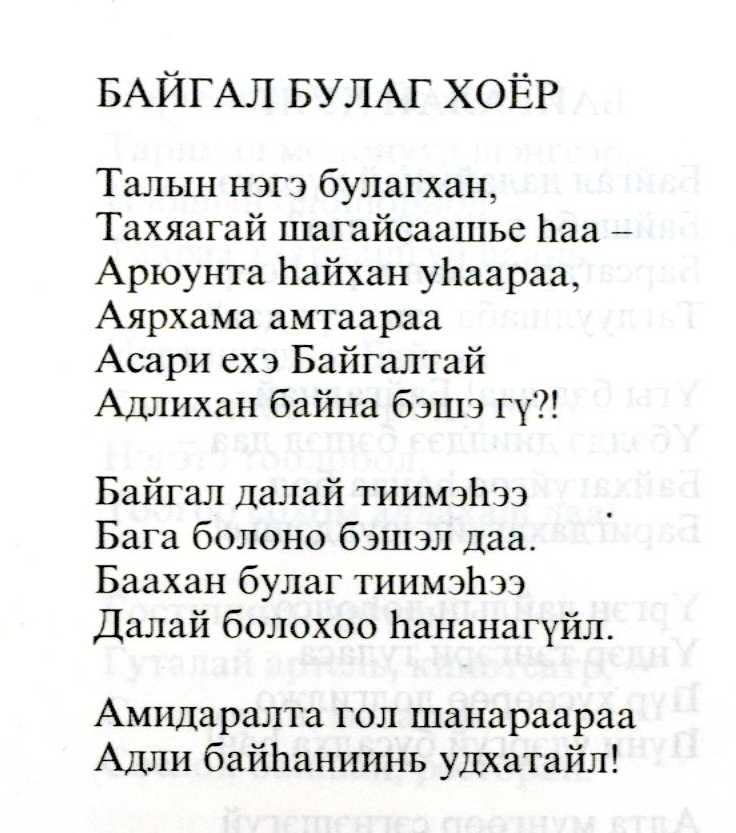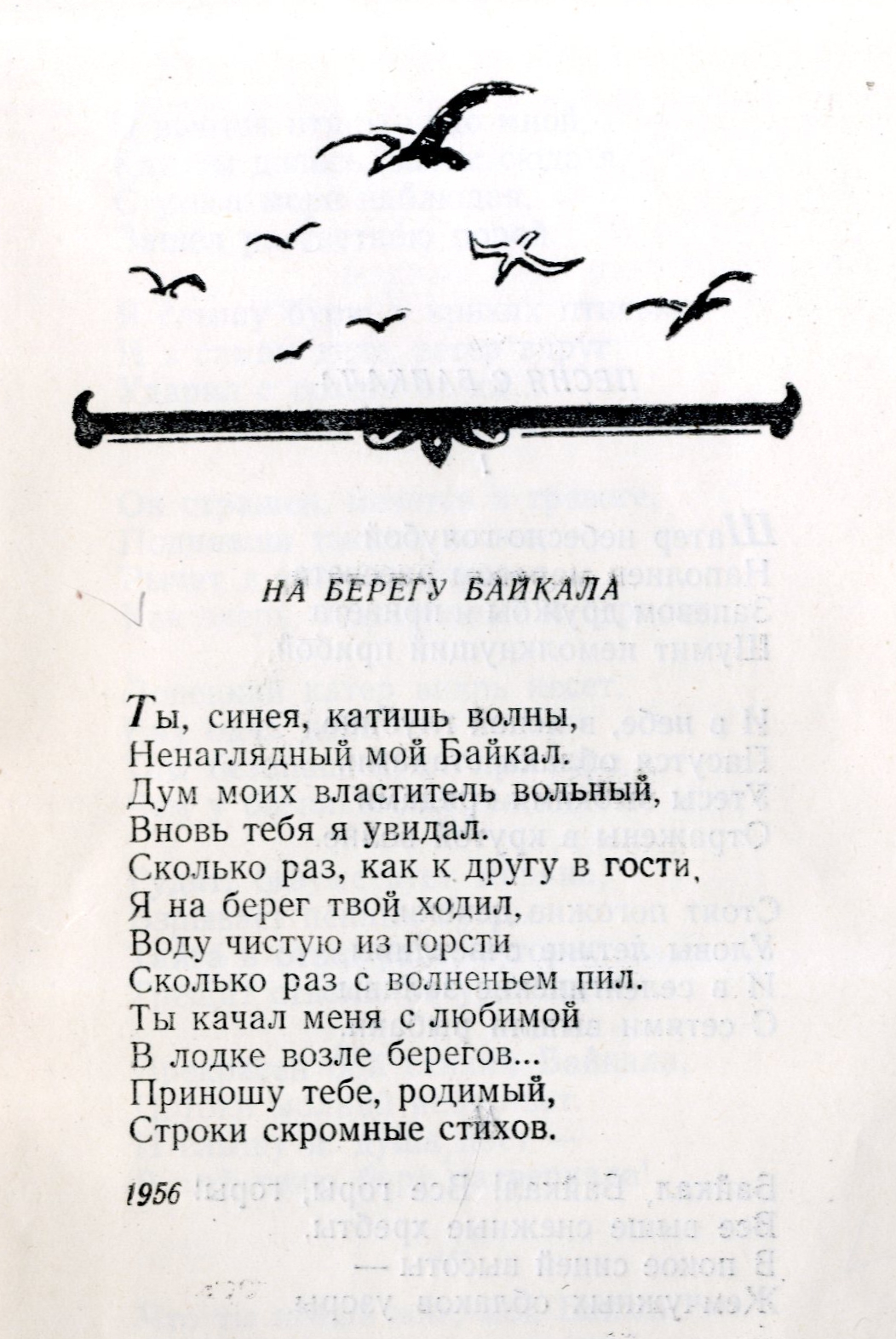 Ангабаев С. Байкал шамдаа hүгэдэнэм // Ангабаев С. Хүсэн шүлэгүүд. – Улаан-Yдэ, 1968. – Н. 28