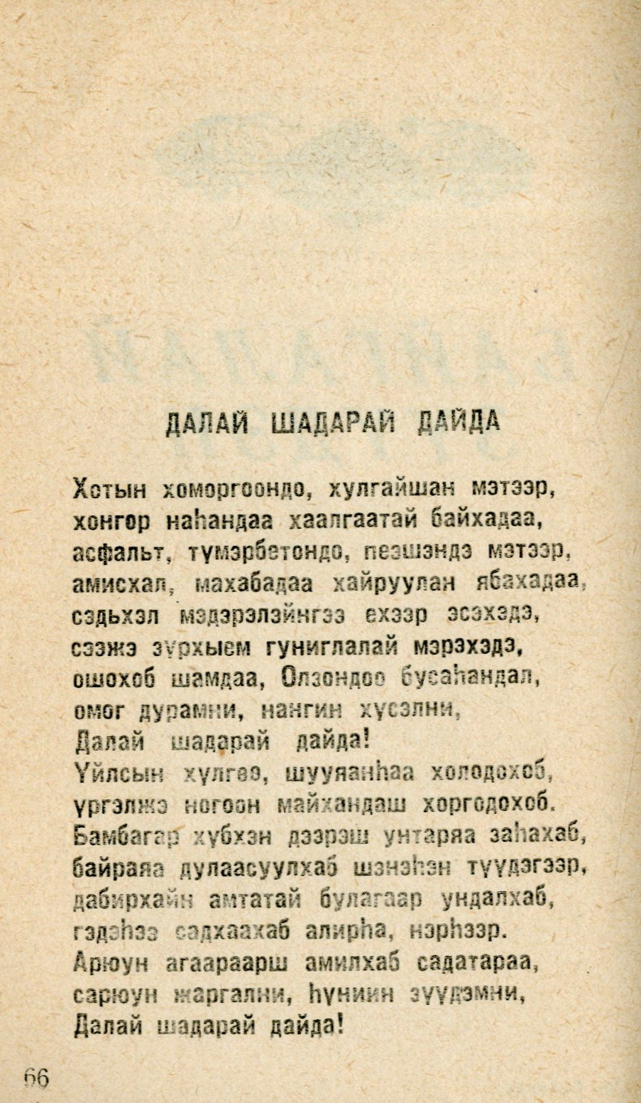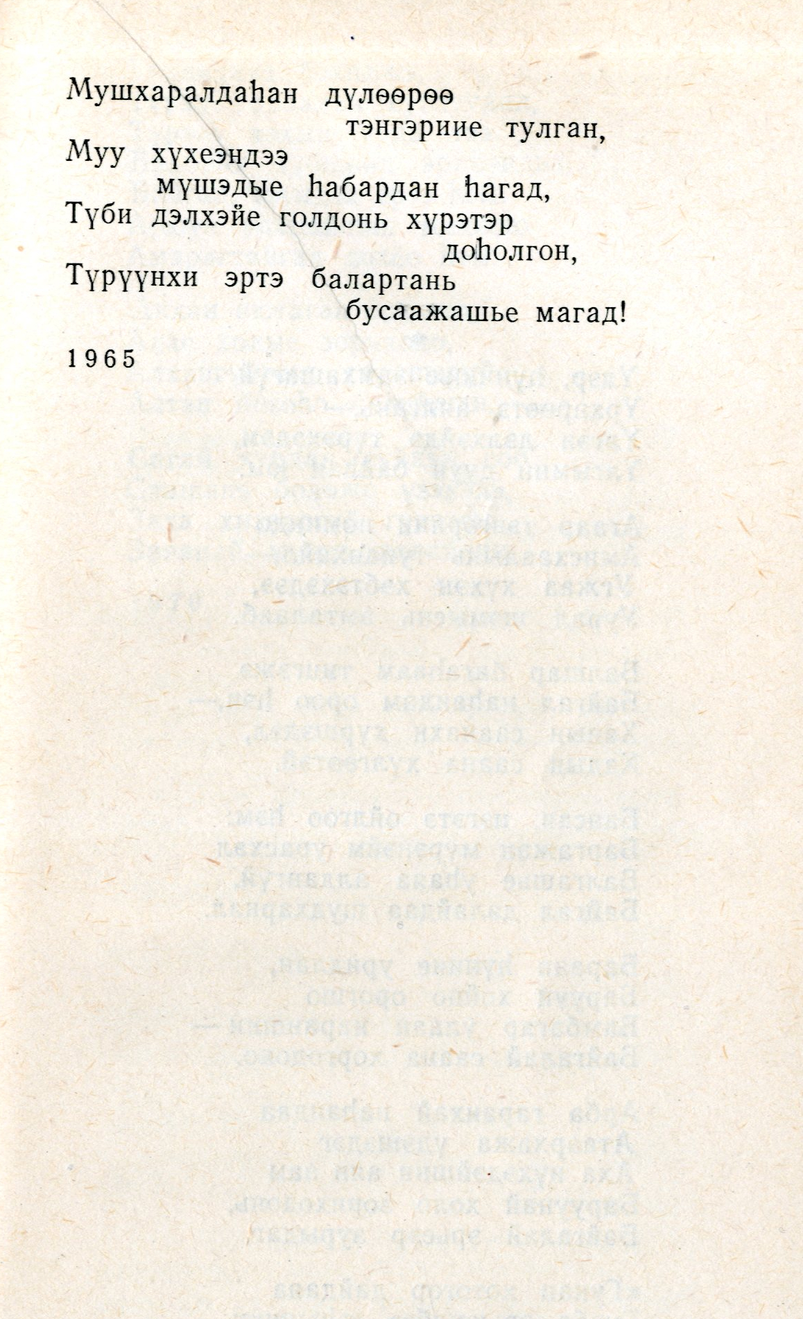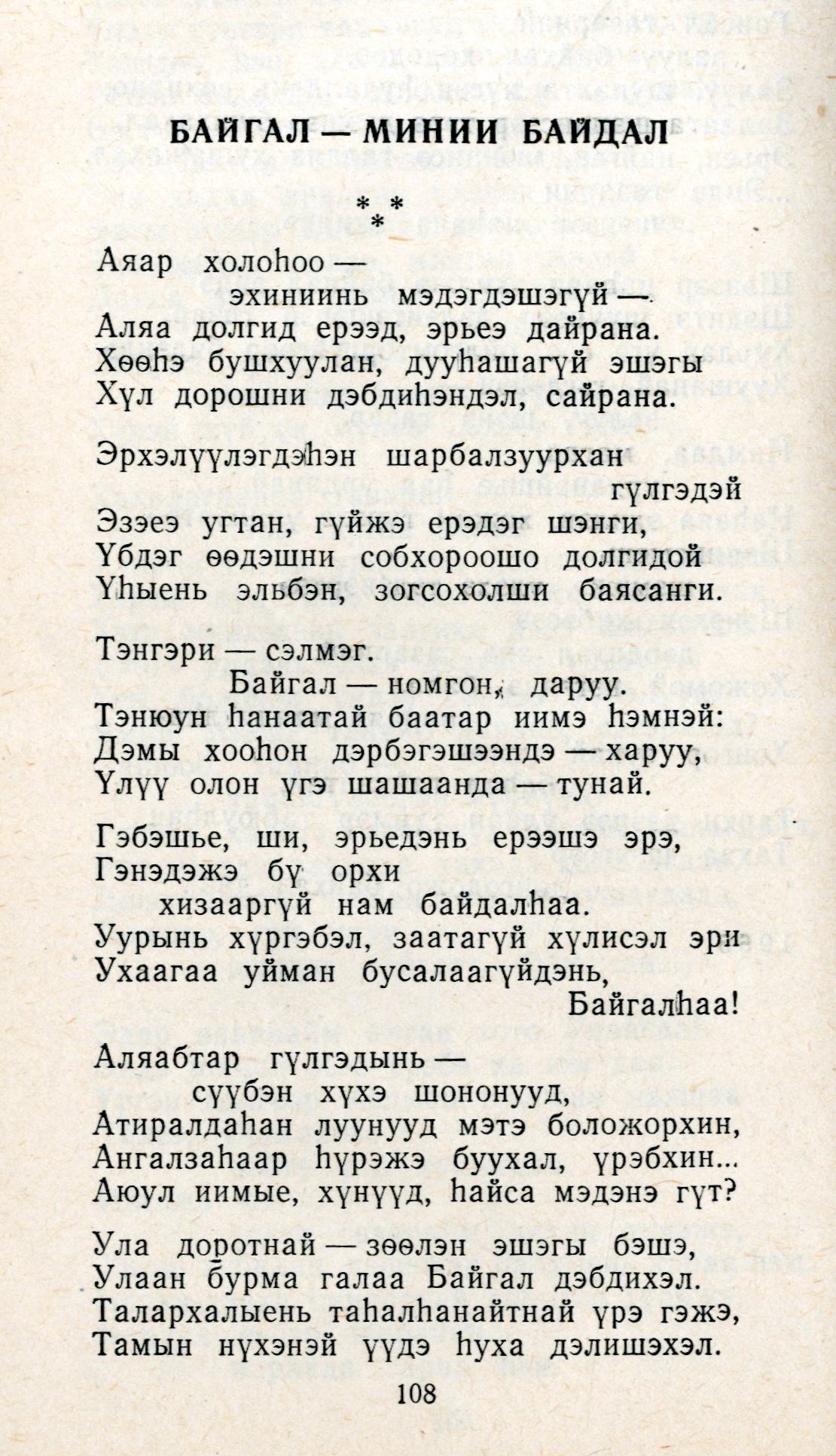 Ангабаев С. Байкал шамдаа hүгэдэнэм // Ангабаев С. Хүсэн шүлэгүүд. – Улаан-Yдэ, 1968. – Н. 28