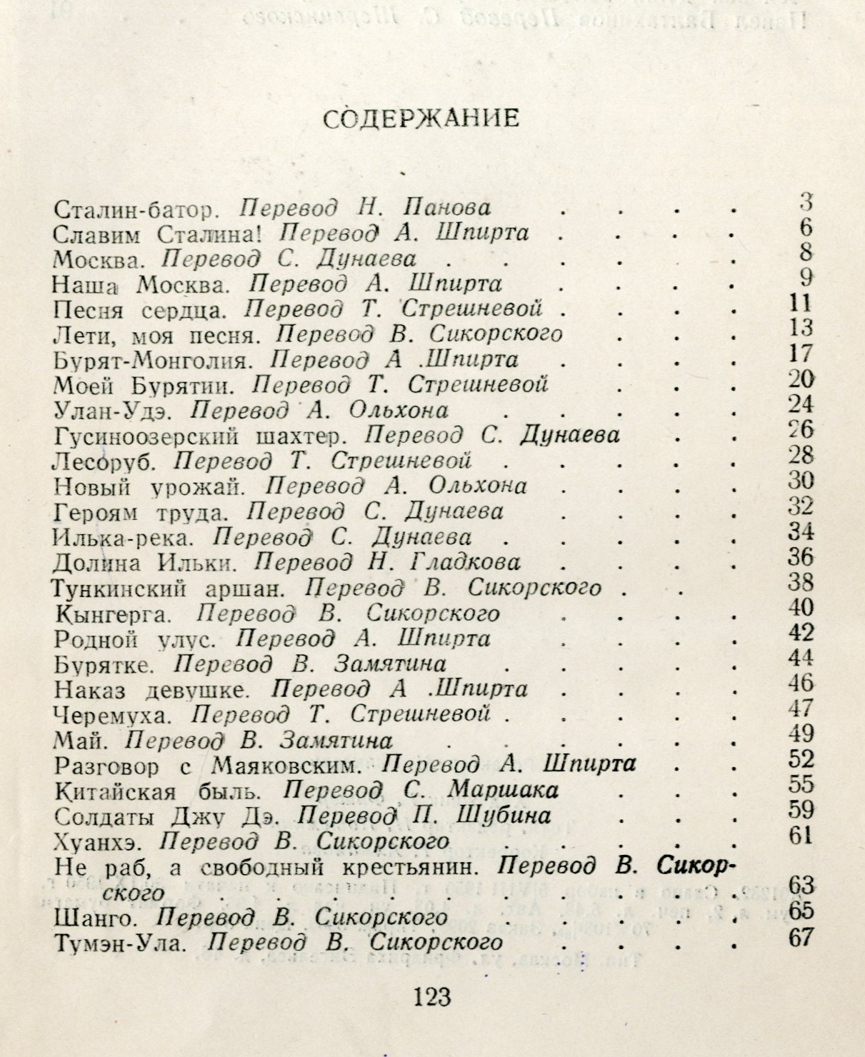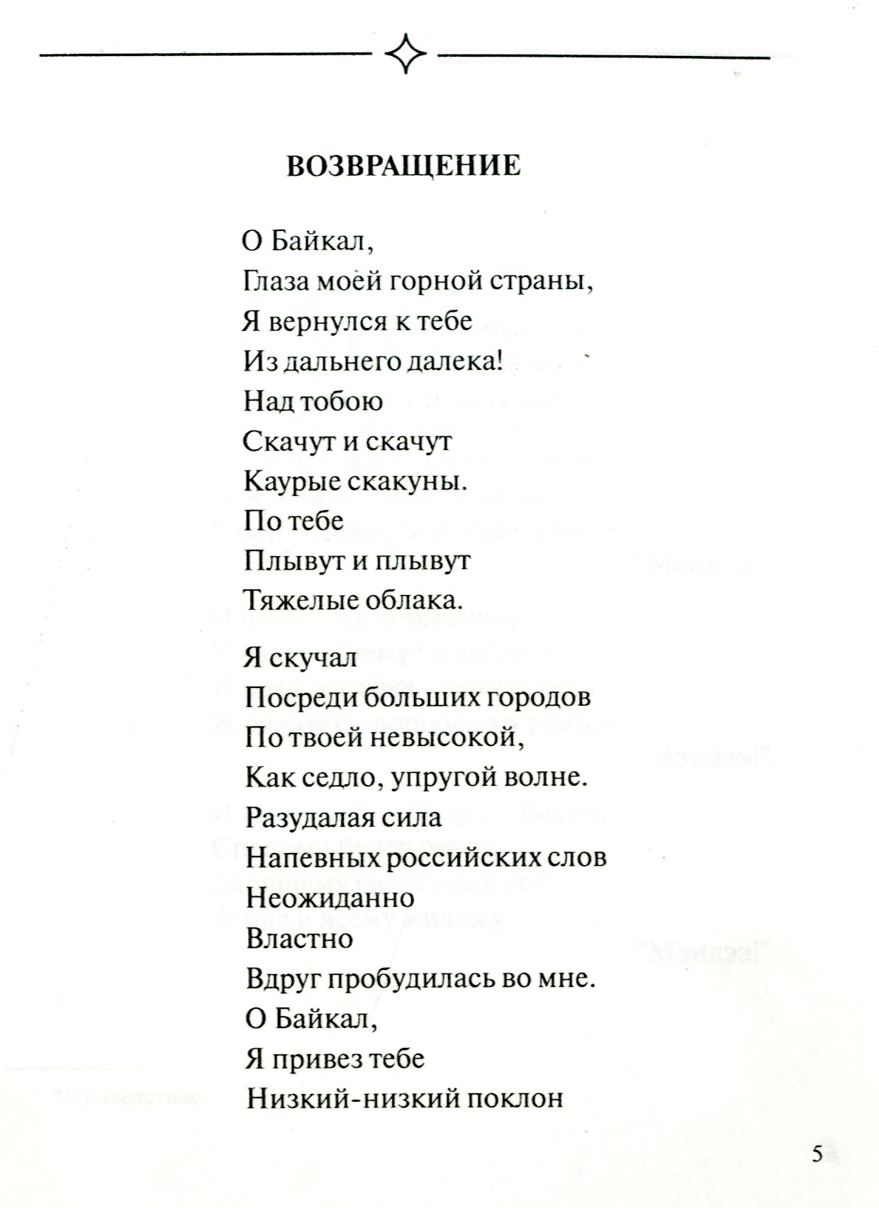 Жалсараев, Д. Байкальское мэндэ : стихи / Д. Жалсараев ; пер. С. Липкин // Жалсараев, Д. Бурятские напевы : стихи. –Улан-Удэ, 1974. – С. 69.